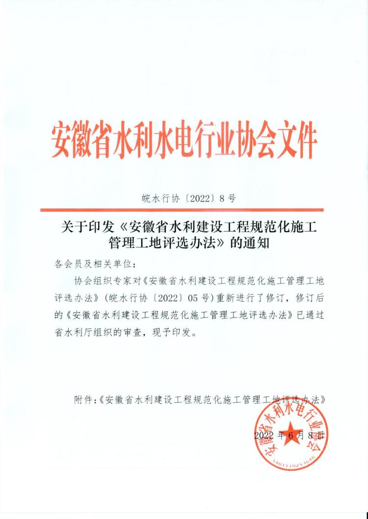 關(guān)于印發(fā)《安徽省水利建設(shè)工程規(guī)范化施工管理工地評選辦法》的通知